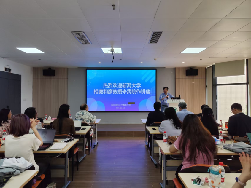 2025年3月13日下午,日本新澙大學(xué)相庭和彥教授、酒井悟教授和長(zhǎng)谷川德教授應(yīng)邀到海南師范大學(xué)教育學(xué)院進(jìn)行學(xué)術(shù)交流。本次學(xué)術(shù)交流在海南師范大學(xué)校友之家會(huì)議室舉辦,由我院院長(zhǎng)張德偉教授主持,蘇亮副教授擔(dān)任現(xiàn)場(chǎng)翻譯,我院百余名師生參與交流。