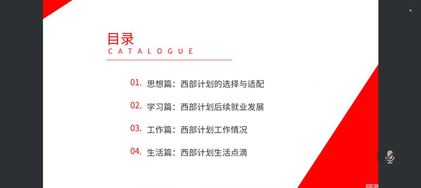 會上,唐飛楊學(xué)長先是詳細解讀了西部計劃相關(guān)政策和西部計劃的優(yōu)劣勢,鼓勵同學(xué)們積極響應(yīng)國家號召,以高度的“熱情”和高昂的“情懷”投身西部計劃,將個人理想融入國家發(fā)展大局,充分發(fā)揮專業(yè)特長,到基層磨煉意志,施展才華。其次講解了西部計劃志愿者后續(xù)多元的就業(yè)方向,以及如何備考西部計劃的筆試和面試。然后分享了自己在服務(wù)期的工作情況及生活點滴。接著,進入互動答疑環(huán)節(jié),同學(xué)們圍繞西部計劃的服務(wù)期限、專業(yè)匹配、未來發(fā)展等方面踴躍提問,唐飛楊學(xué)長耐心傾聽,結(jié)合自身經(jīng)歷逐一為同學(xué)們答疑解惑。“努力讓選擇變得正確,才是正確的選擇”,最后,學(xué)長以一句衷心的勉勵結(jié)束了此次會議。
