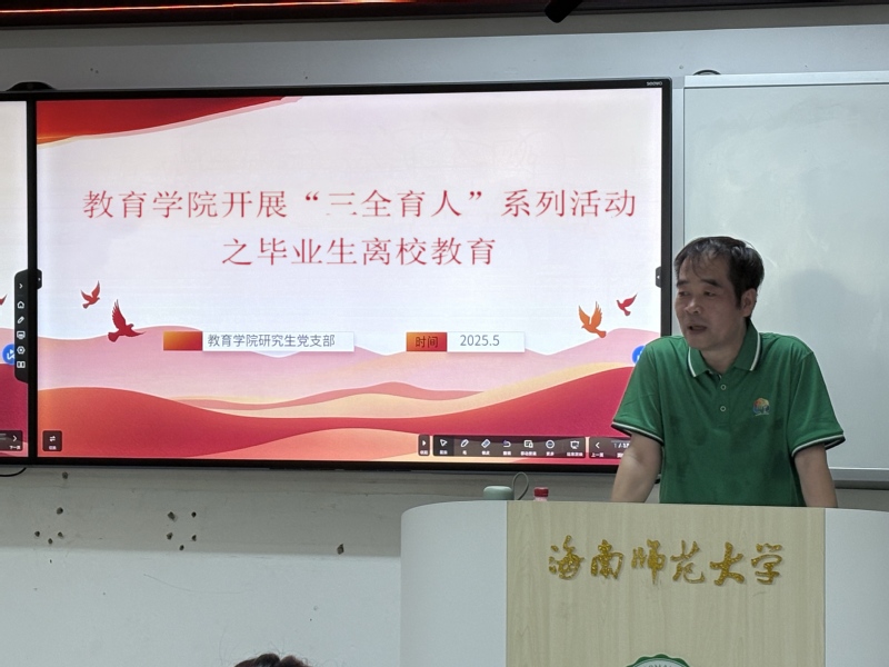 5月22日,教育學(xué)院在田家炳103教室開展“三全育人”系列活動之畢業(yè)生離校教育。通過開展“畢業(yè)生離校教育”與“黨徽閃耀?逐夢新程”兩大活動,為即將踏上新征程的2025屆研究生上好最后一堂思政課,激勵他們以堅定信仰和奮斗姿態(tài)投身海南自貿(mào)港建設(shè)。