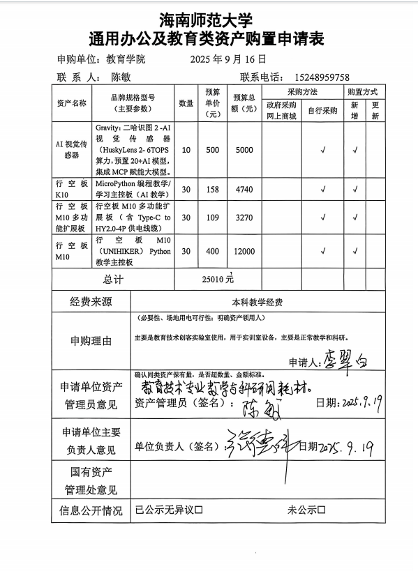 海南師范大學(xué)教育學(xué)院申請(qǐng)采購以下設(shè)備,根據(jù)學(xué)校相關(guān)規(guī)定,對(duì)購置物品進(jìn)行公示如下,公示時(shí)間為9月22日-24日,如有異議請(qǐng)撥打電話:65889325。